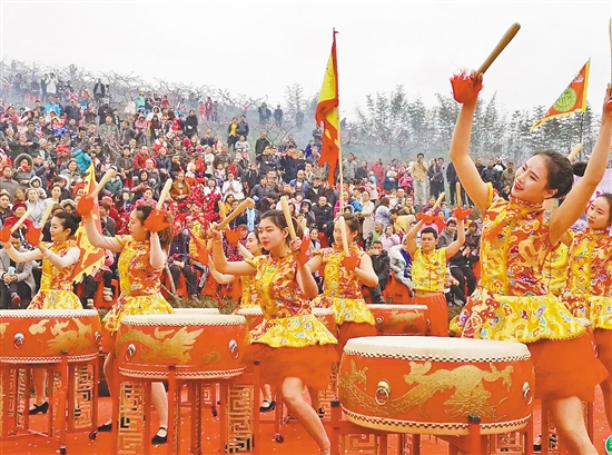 在开幕式上,由罗金耀创作导演的实景表演《春转桃花缘·梦寻真武山》讲述了汉帝时期,帝出宫巡游,游至绥江真武山,只见长江东转处,漫山遍野桃花盛开,好一个人间仙境。帝龙颜大悦,遂命百官赏花,并下旨满山种桃。正兴致时,有民夫闯入,帝大怒,官查案,引出因真武仙桃结缘的仙凡之恋故事。开幕式还有桃花仙子巡游散花、祭桃、敬献桃花酒等节目,本届桃花乡村旅游文化节还举办了“转运桃花缘”相亲大会、桃花长街宴等活动。(昭通日报 记者王明贵)