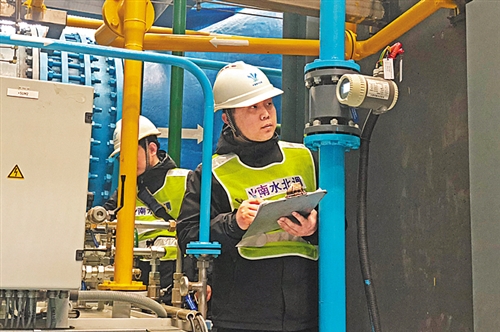 2月15日,南水北调中线干线惠南庄泵站工作人员在巡检。为保障北京市用水,工作人员24小时巡视设备运行情况。本报记者吉蕾蕾/摄