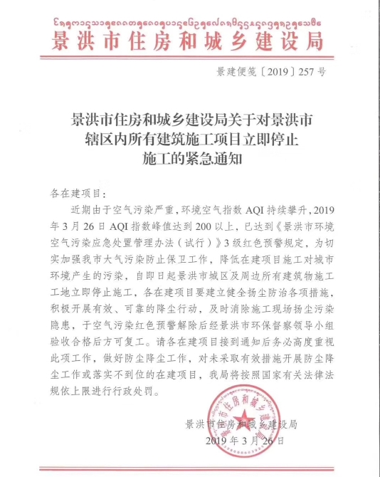 3月26号,景洪市住房和城乡建设局发布了关于对景洪市辖区所有建筑施工项目立即停止施工的紧急通知。