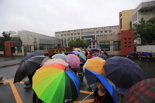 2018年7月5日,江苏淮安,冒雨为孩子报名的家长。