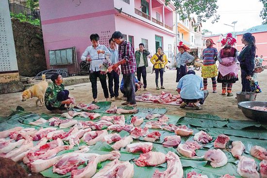 村民到大榕树脚分发龙肉(祭祀后的猪肉叫龙肉)