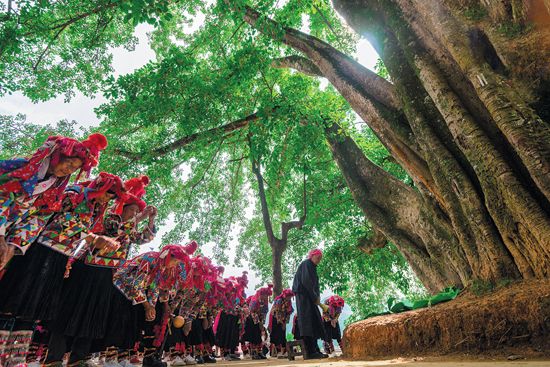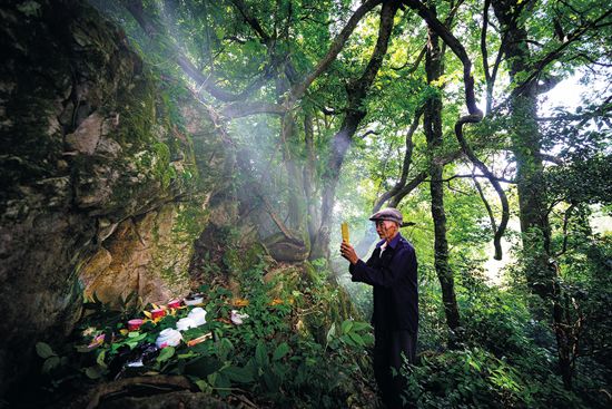 衣着盛装的花倮妇女跟着么公进行叩拜,感恩荞神给花倮人予生命