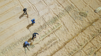 古浪县境内的黑岗沙风沙口,第二代治沙人在沙漠中压沙治沙。新华社 记者范培珅摄