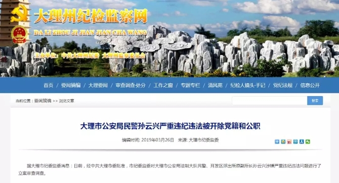 大理市公安局法制大队民警、开发区派出所原副所长孙云兴涉嫌严重违纪违法被开除党籍和公职