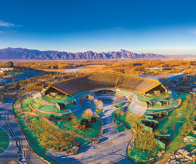 妫水河畔,长城脚下,2019北京世界园艺博览会的标志性建筑——中国馆坐落在一片自然田园之中,仿佛一柄如意——如意之姿,祝福国泰民安;圆满轮廓,祈盼中华圆梦。