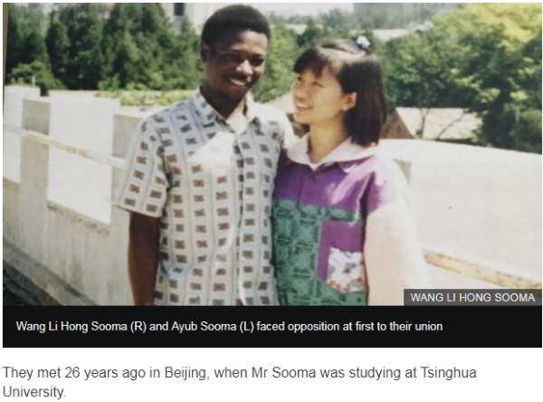 26年前,中国女孩王丽红(音)与在清华大学读书的乌干达人苏玛(Ayub Sooma)相遇相恋。图片来源:BBC网站截图