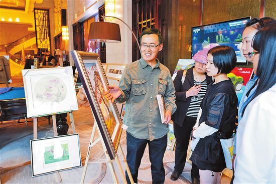 3月30日,环保画家刘永、马萍、张家敏、陈龙生与李宗荣在七彩云南温德姆至尊豪廷大酒店举办环保主题画展。此次画展除有反映自然由破坏到保护的直观作品外,还有多幅反映当下科技发展的作品。其中《水电硅一体化》《新能源汽车》《氢燃料电池》用丰富的色彩和大胆的想象表达人类对环境的保护能够带来和谐结果的期望。图为刘永向前来参观的市民讲解画作。(云南日报 记者陈飞)