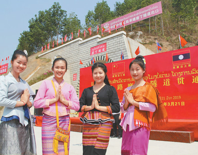 老挝年轻人身着节日盛装在磨丁隧道贯通仪式现场合影留念。