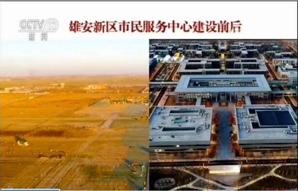 这是雄安新区市民服务中心建设前后。它新区第一个高标准建设的城建项目,今年年初开始,26家高新高端企业在雄安市民服务中心企业办公区挂牌,并且已经陆续入驻办公。
