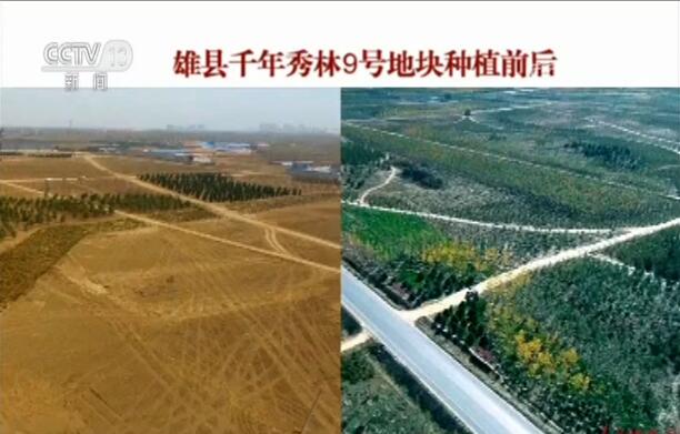 这是位于雄县的千年秀林9号地块种植前后。2017年底至今,“千年秀林”工程已造林11万亩、植树1100万株。未来新区森林覆盖率将由现在的11%提高到40%。