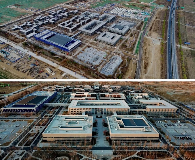 拼版照片:上图为2018年3月29日拍摄的正在建设中的雄安市民服务中心;下图为2018年12月7日拍摄的竣工并已投入使用的雄安市民服务中心。新华社记者 朱旭东/摄