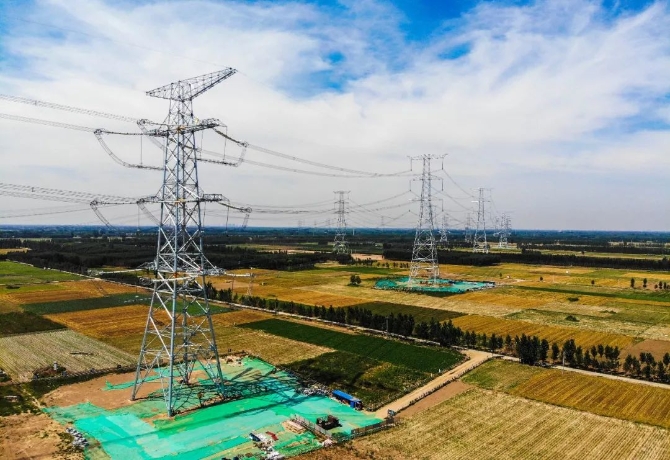 2018年6月29日无人机拍摄的投入运营的雄安新区1000千伏定河线迁改工程。新华社记者 李晓果/摄