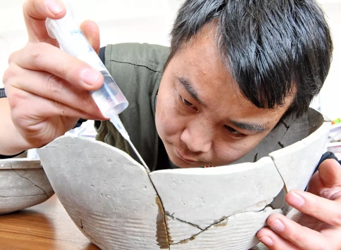 2018年4月26日,考古工作者王刚在修复容城县晾马台镇南阳村遗址出土的文物。新华社记者 牟宇/摄