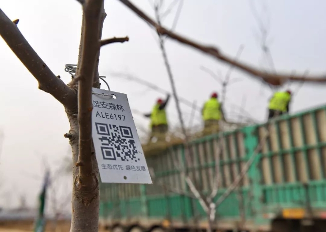 这是河北雄安新区“千年秀林”栽植苗木上的二维码(2018年3月21日摄)。 新华社记者 牟宇/摄