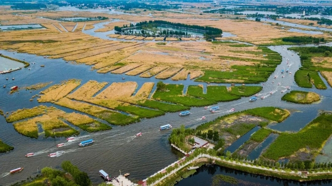 在位于河北雄安新区境内的白洋淀景区,游人乘坐游船欣赏美景(2018年4月30日无人机航拍)。新华社记者 沈伯韩/摄