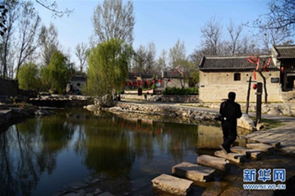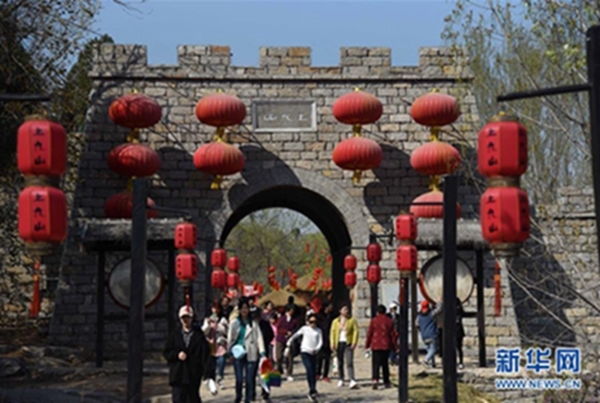 3月31日,游客在上九山村入口处游览。山东省邹城市石墙镇上九山村始建于宋代,是一座依山而建的石头村,有明清建筑风格的古民居300余套,古朴传统的村貌吸引众多游客。2019年1月,上九山村入选第七批中国历史文化名村。 新华社 记者王凯/摄