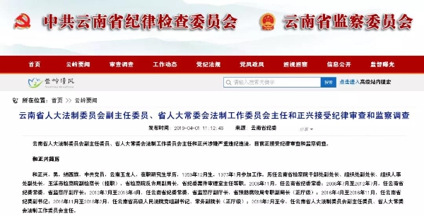 据云南省纪委消息:云南省人大法制委员会副主任委员、省人大常委会法制工作委员会主任和正兴涉嫌严重违纪违法,目前正接受纪律审查和监察调查。
