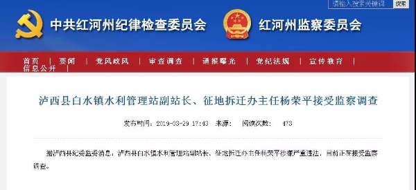 泸西县白水镇水利管理站副站长、征地拆迁办主任杨荣平接受监察调查