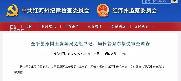 据金平县纪委监委消息:金平县原国土资源局党组书记、局长普振东涉嫌严重违纪违法,目前正在接受纪律审查和监察调查。