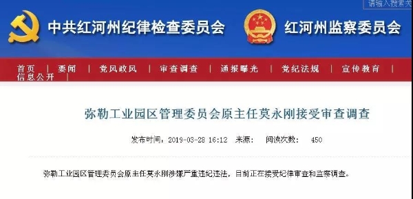 据红河州纪委的消息:弥勒工业园区管理委员会原主任莫永刚涉嫌严重违纪违法,目前正在接受纪律审查和监察调查。