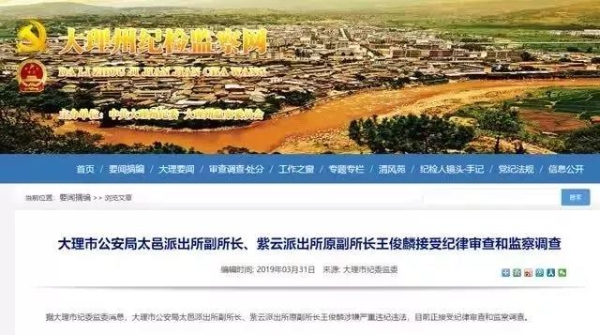 大理市公安局太邑派出所副所长、紫云派出所原副所长王俊麟被查