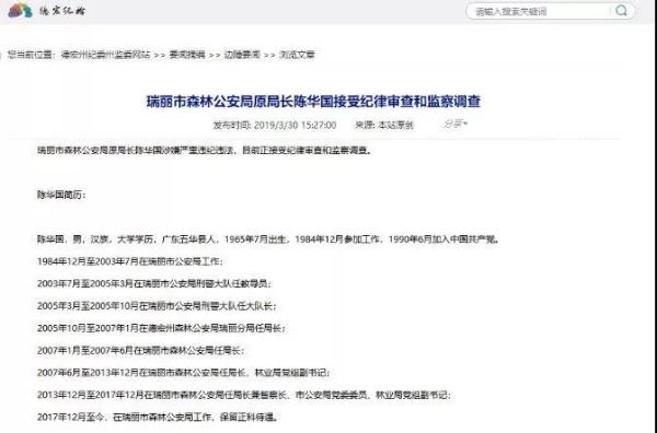 瑞丽市森林公安局原局长陈华国接受纪律审查和监察调查