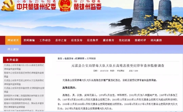 据楚雄州纪委州监委网站的消息:元谋县公安局禁毒大队大队长高维忠涉嫌严重违纪违法,目前正接受纪律审查和监察调查。