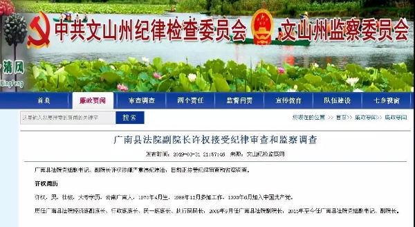 据文山纪检监察网的消息:广南县法院党组副书记、副院长许权涉嫌严重违纪违法,目前正接受纪律审查和监察调查。