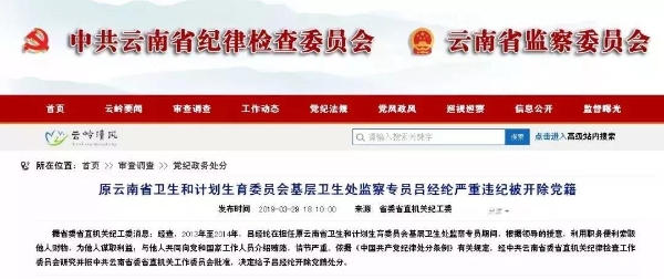 原云南省卫生和计划生育委员会基层卫生处监察专员吕经纶严重违纪被开除党籍