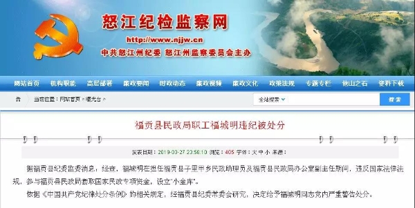 据福贡县纪委监委消息:经查,福城明在担任福贡县子里甲乡民政助理员及福贡县民政局办公室副主任期间,违反国家法律法规,参与福贡县民政局套取国家民政专项资金,设立“小金库”。