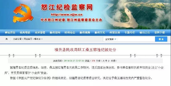 据福贡县纪委监委消息:经查,桑玉娜在福贡县民政局工作期间,违反国家法律法规,参与单位套取民政专项资金,设立“小金库”,并负责保管部分“小金库”资金。