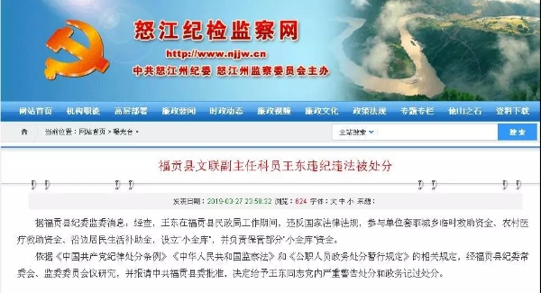 依据《中国共产党纪律处分条例》《中华人民共和国监察法》和《公职人员政务处分暂行规定》的相关规定,经福贡县纪委常委会、监委委员会议研究,并报请中共福贡县委批准,决定给予王东同志党内严重警告处分和政务记过处分。