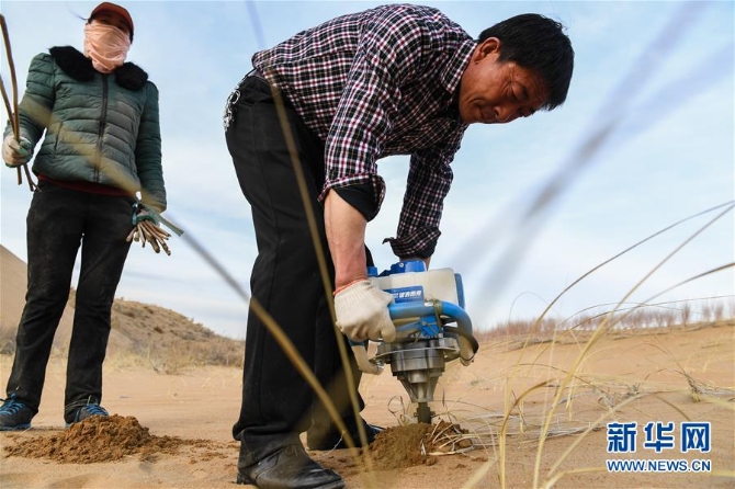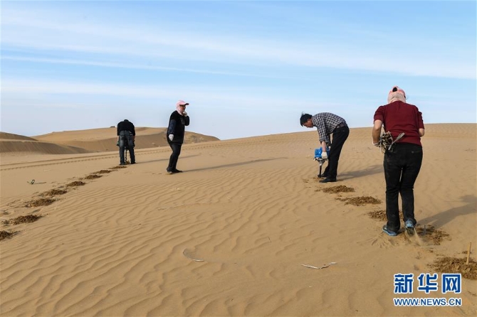 4月1日,在达拉特旗银肯塔拉生态旅游区,治沙工人前往下一处种植点。内蒙古自治区达拉特旗银肯塔拉生态旅游区位于库布其沙漠东端。近日,一批治沙工人在此地开始为期一个多月的沙柳种植工作,对库布其沙漠进行治理。
