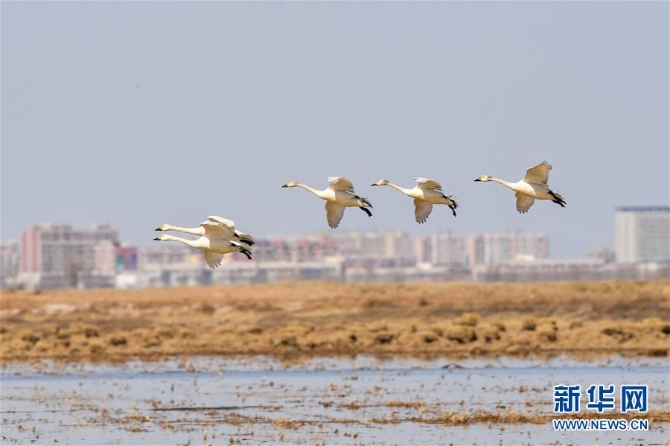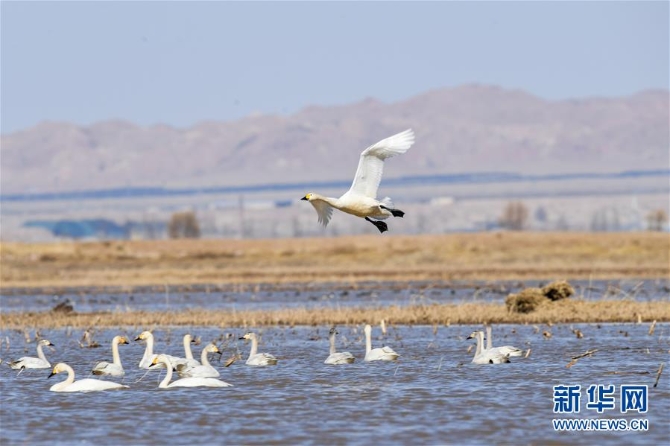 天鹅在杭锦旗独贵塔拉镇的黄河浅滩上飞翔(4月2日摄)。新华社 记者刘磊/摄