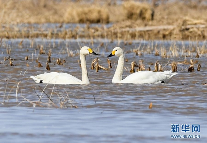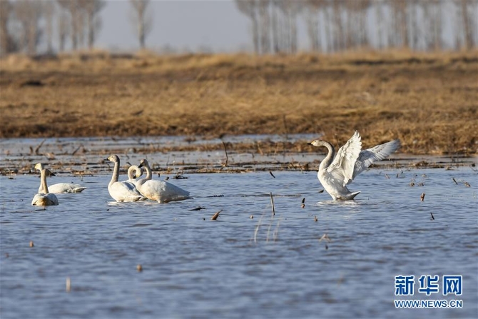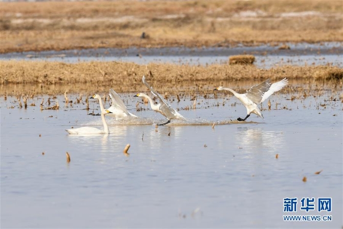 这是4月2日在杭锦旗独贵塔拉镇的黄河浅滩拍摄的天鹅。近日,内蒙古自治区杭锦旗独贵塔拉镇的黄河浅滩迎来一批天鹅到此栖息,成为当地一景。新华社 记者刘磊/摄