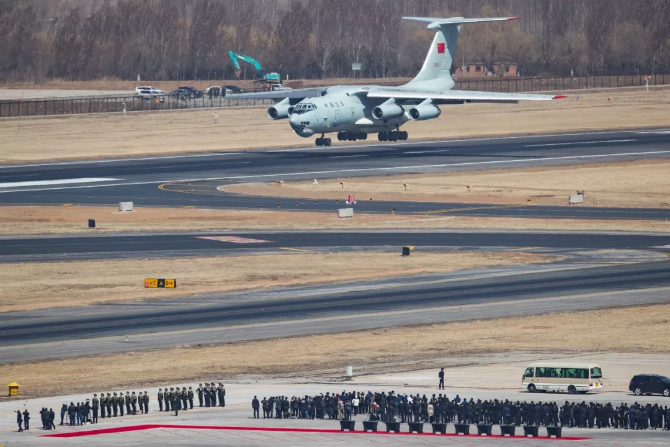 ●仪式的尾声,是中方飞机关闭舱门,发动机开车,飞机滑向起飞线,经地面塔台确认后,载着烈士棺椁的飞机呼啸北飞去,跨过北纬40度,就是祖国怀抱了!