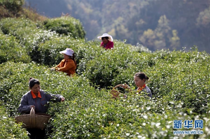 3月28日,茶农在陕南绿茶有限公司位于骆家坝镇的生态茶园里采摘春茶。随着气温回升,地处秦巴山区腹地的陕西汉中市西乡县骆家坝镇的茶农忙着采摘春茶。 新华社记者都红刚摄