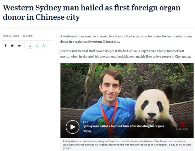 菲利普的感人事迹还引起了英国广播公司(BBC)等其他国家媒体的关注。BBC报道称,来自澳大利亚的菲利浦在中国重庆因糖尿病并发症去世,家人按照遗愿捐出他的多个器官。他的这一举动改变了五个人的命运,人们将他称为“英雄”和“天使”。