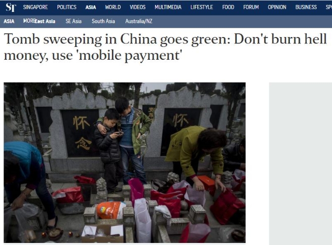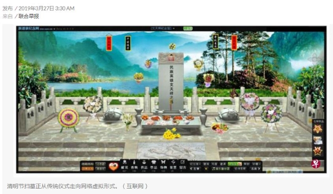 新加坡《联合早报》日前也发文称,在中国,清明节扫墓正从传统仪式走向网络虚拟形式,其中一种就是“网上扫墓”,即用户在纪念网站上注册一个账号,成为用户后,就可以为已逝亲友建立虚拟的纪念空间,供缅怀故人。