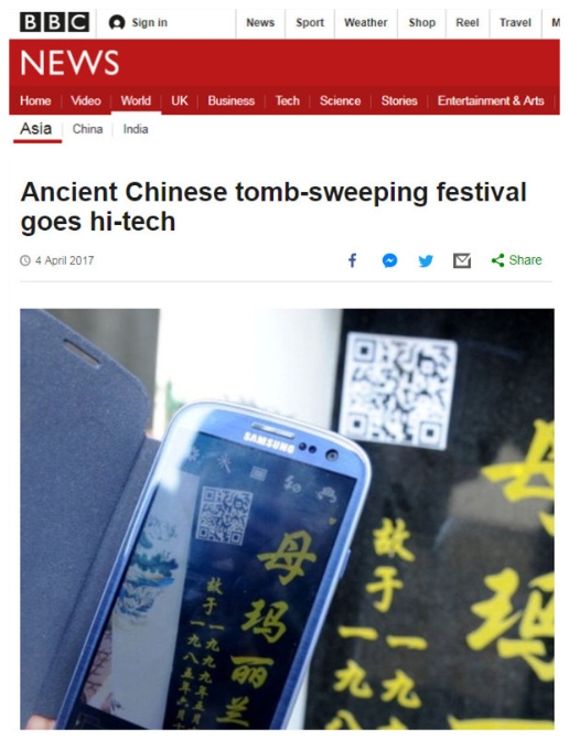 其实,早在两年前,“雨花台功德园”就对扫墓方式进行了创新,推出了一项在线直播的“代客扫墓”服务。逝者亲属可通过公墓微信公众号专门开设的视频直播间,观看“代扫”仪式的全程。当时,英国广播公司(BBC)还对此进行了报道。BBC还关注到,在中国,还有人将亲人生前的照片、视频资料集结整理后,制作成二维码刻在墓碑上,以便后人在线追思。