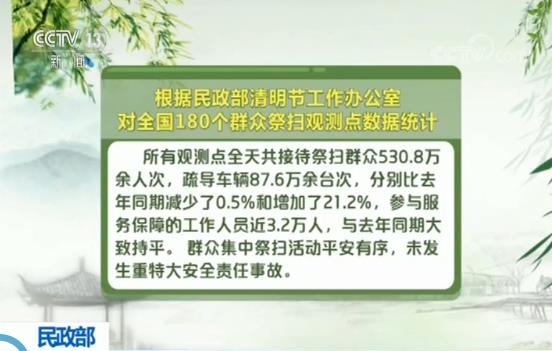 根据民政部清明节工作办公室对全国180个群众祭扫观测点数据统计,所有观测点全天共接待祭扫群众530.8万余人次,疏导车辆87.6万余台次,分别比去年同期减少了0.5%和增加了21.2%,参与服务保障的工作人员近3.2万人,与去年同期大致持平。 群众集中祭扫活动平安有序,未发生重特大安全责任事故。