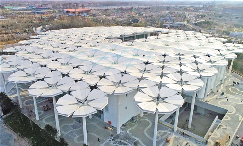 4月1日拍摄的北京世园会国际馆外景(无人机拍摄)。经济日报记者 赵 晶/摄