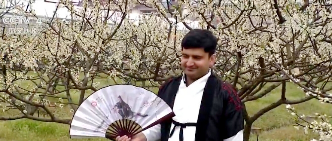 外国游客:我正在在风筝上绘制脸谱画,今天我们还观赏了槜李花,非常美丽,很有意思,接下来还要去放飞自己制作的风筝。