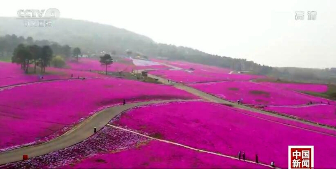 随着清明小长假的到来,江苏句容天王镇芝樱公园里300多亩480万株的芝樱花进入了盛开期,人们陶醉在粉色的花海之中赏花观景,拥抱春天,感受假日的欢乐与美好。