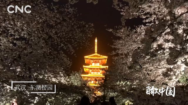 武汉东湖樱花园占地260亩,栽种樱花树10000株,樱花品种58个。夜幕低垂,白色、粉色、桃红色的樱花海洋,满园飘香。