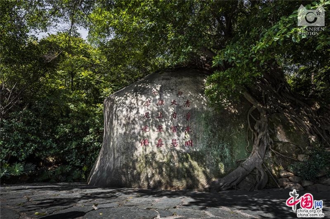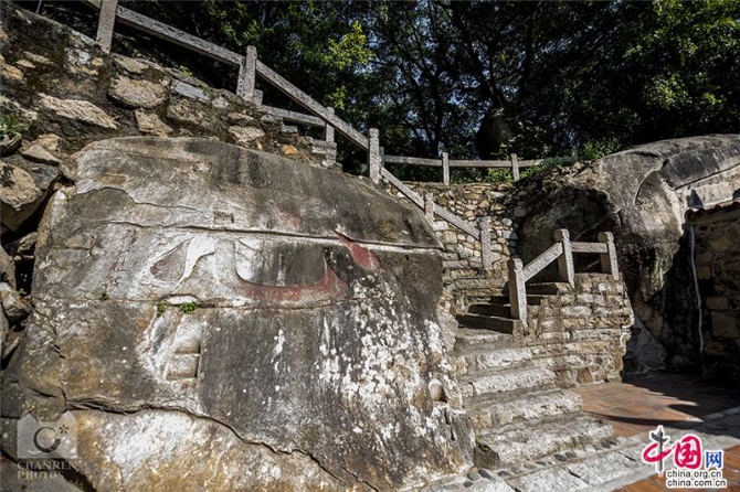 山石上刻着摩尼教咒语:"劝念清净光明,大力智慧,无上至真,摩尼光佛"。
