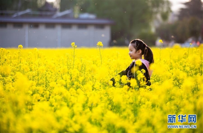 4月7日,小朋友在武安市西石门村的油菜花田里游玩。 近日,河北省武安市西石门村的油菜花竞相开放,绵延的花海一片金黄,吸引游人前来观赏。 新华社 记者王晓/摄