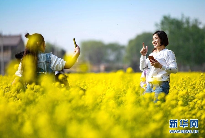 4月7日,游客在武安市西石门村的油菜花田里自拍留念。 近日,河北省武安市西石门村的油菜花竞相开放,绵延的花海一片金黄,吸引游人前来观赏。 新华社 记者王晓/摄