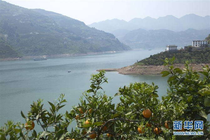 时下,湖北省宜昌市秭归县晚熟脐橙果熟飘香,与峡江相映美景如画。 新华社发(王罡 摄)