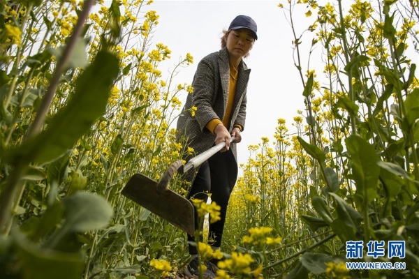 4月8日,在河北省石家庄市井陉县孙庄乡,村民在油菜地里锄草。 新华社发(王保龙 摄)